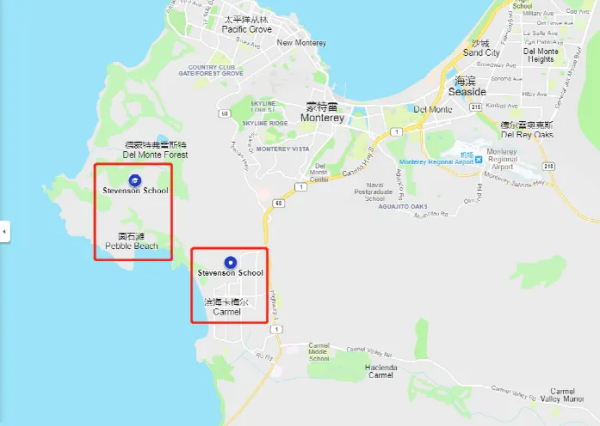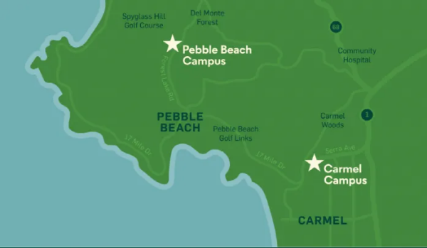【地理位置】位于加利福尼亚州中部海岸蒙特利半岛的两个校区,PK-8年级位于卡梅尔校区,9-12年级位于圆石滩校区。