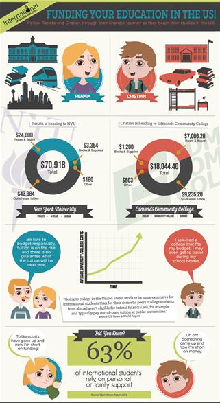 以下的信息图表希望可以帮助留学生知道自己在美国留学时有什麽方法可以增添经费。图表中,Renata 和 Cristian 两位都是来美国读书的国际学生,一位在私立大学上课,另一位在社区大学上课。和63%的国际学生一样,他们的主要留学经济来源都是来自家庭或父母资助。然而,当一但发生了突发事件没有了这主要资助,他们就需要自己找方法来维持留学生涯。