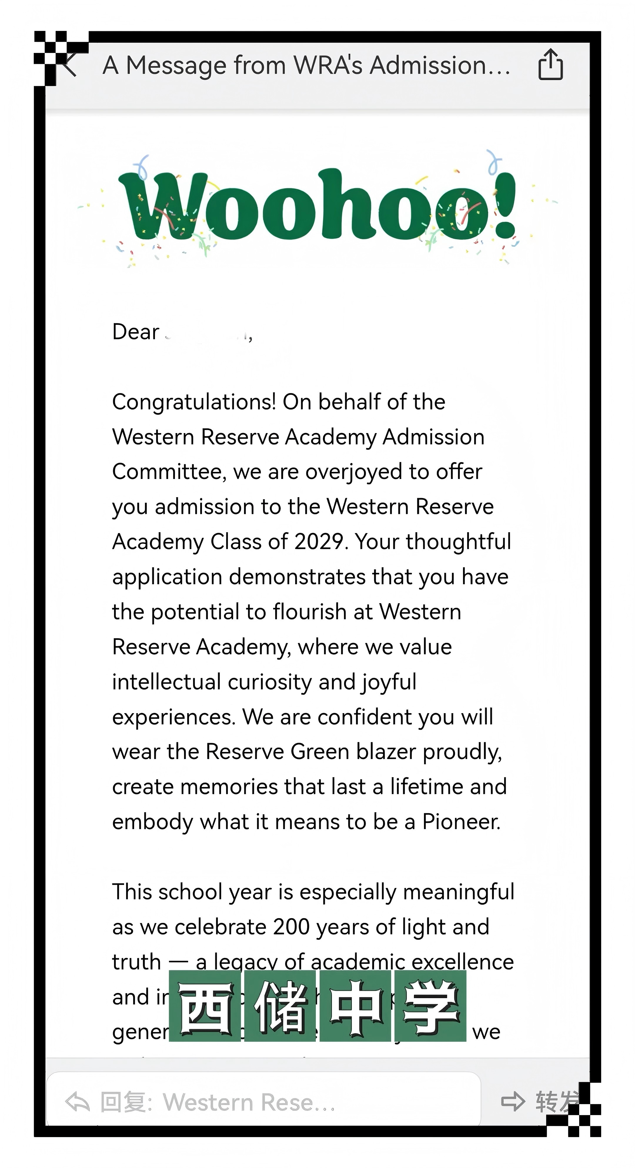 【录取喜报】恭喜留美网学子L同学斩获西储中学录取offer