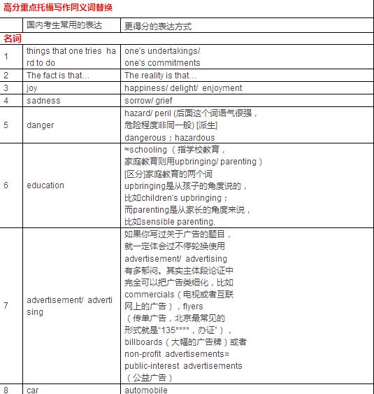 在ETS规定的托福独立写作评分标准中,有一项是针对词汇和表达的,同样托福写作想要拿高分,在词汇的应用上也要有一定的技巧,整理了一些托福写作重点词汇的高分替换,希望可以帮助大家~~ 高分重点托福写作同义词替换