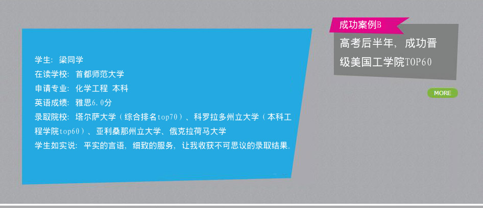 可选择适合自己的学校,包括:地理位置,专业选择,学校费用等。另外,在美国纯英文环境中学习,语言学习的增长通常要比在国内学习提高的更快。
